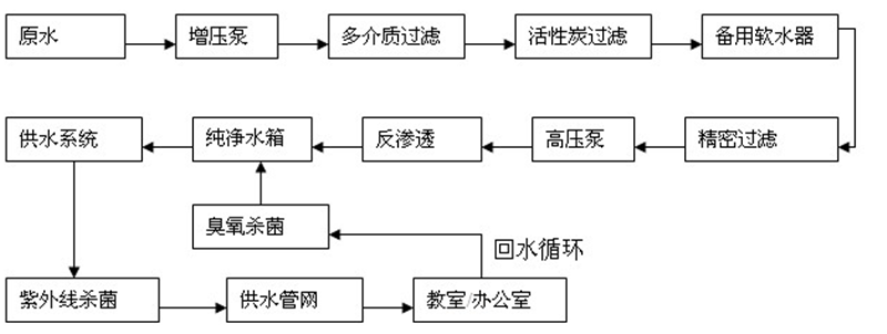 在學校安裝一套足夠容量的智能直飲水主機(包括原水箱、純水箱、多級組泵、活性炭等多級過濾器、紫外線滅菌系統等),生產制造出健康活性直飲水,然后經由恒壓滅菌機通過封閉管網(PP-R食品管材)輸送至教室各飲水終端,隨取隨飲。中小學活動場地主要以教室為主,飲水終端主要放在人群集中的教室或者走廊以方便學生隨時飲水,而達到效益最大。