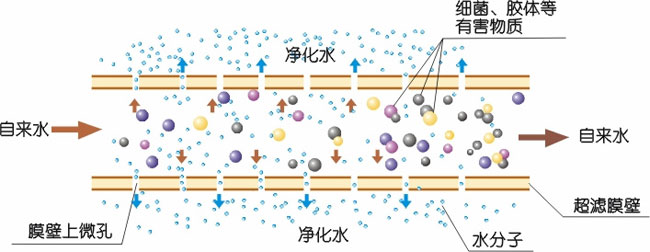 每米長的超濾膜絲管壁上約有60億個0.01微米的微孔,其孔徑只允許水分子、水中的有益礦物質和微量元素通過,而最小細菌的體積都在0.02微米以上,因此細菌以及比細菌體積大得多的膠體、鐵銹、懸浮物、泥沙、大分子有機物等都能被超濾膜截留下來,從而實現了凈化過程。