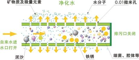 自來水先進入超濾膜管內,在水壓差的作用下,膜表面上密布的許多0.01微米的微孔只允許水分子、有益礦物質和微量元素透過,成為凈化水。而細菌、鐵銹、膠體、泥沙、懸浮物、大分子有機物等有害物質則被截留在超濾膜管內,在超濾膜進行沖洗時排出。