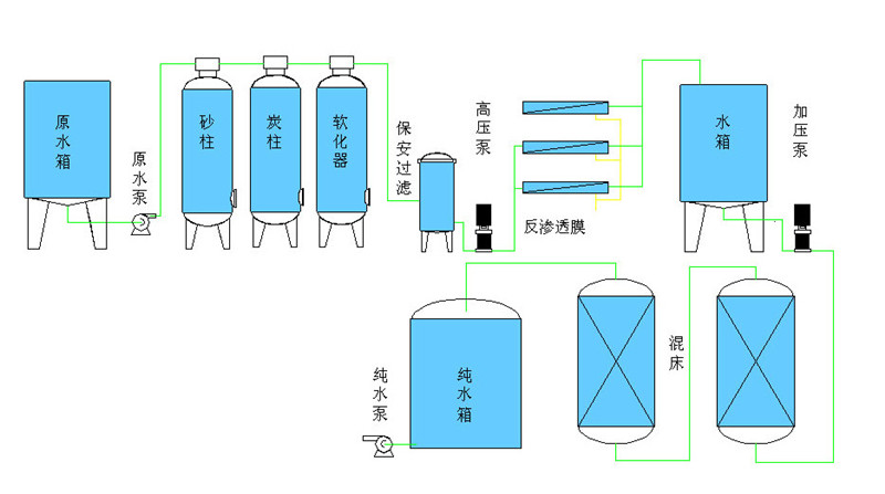 3、后處理系統:是在反滲透不能滿足出水要求的情況下增加的配置。主要包括陰床、陽床、混床、殺菌、超濾、EDI等其中的一種或者多種設備。后處理系統能把反滲透的出水水質更好的提高,使之滿足使用要求。