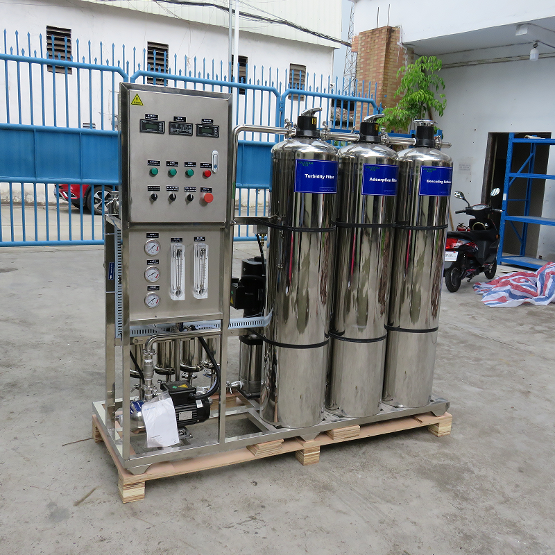 流程: 原水 → 原水箱 → 原水泵 →多介質過濾器 (石英砂過濾器)→活性炭過濾器 →軟水處理器(添加阻垢劑裝置) → 精密過濾器 → 高壓泵 → 一級反滲透(RO)裝置 →紫外線殺菌裝置(臭氧殺菌裝置) → 用水點