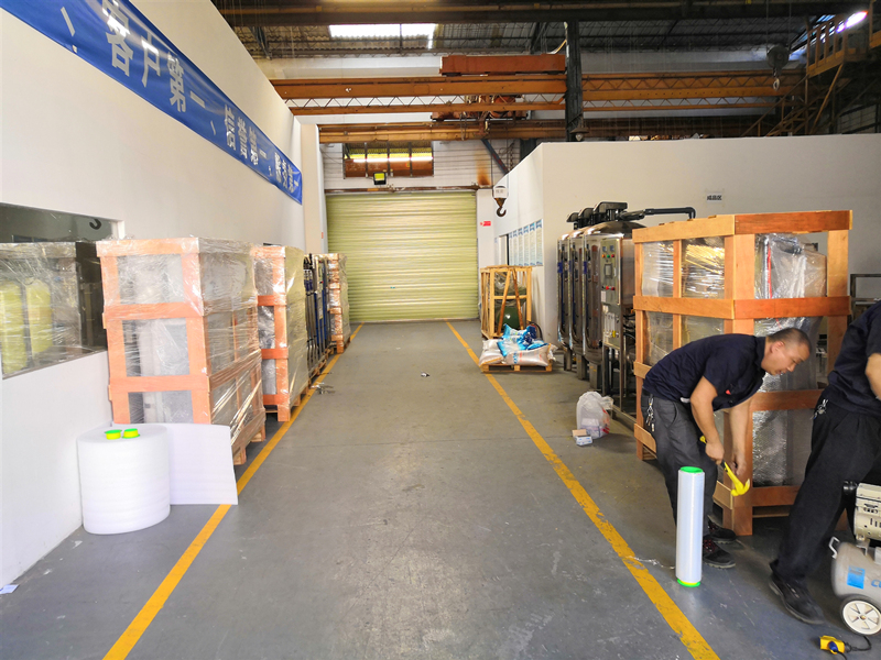 5、離子軟化系統/加藥系統:R/O裝置為了溶解固體形物的濃縮排放和淡水的利用,為防止濃水端特別是RO裝置最后一根膜組件濃水側出現CaCO3,MgCO3,MgSO4,CaSO4,BaSO4,SrSO4,SiSO4的濃度積大于其平衡溶解度常數而結晶析出,損壞膜原件的應有特性,在進入反滲透膜組件之前,應使用離子軟化裝置或投放適量的阻垢劑阻止碳酸鹽,SiO2,硫酸鹽的晶體析出.