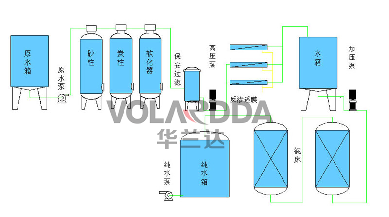 上述工藝的處理效果為:原水總固體從200mg/L左右可降到1.6mg/L,電導率從300μS/cm左右可降到3μS/cm(原水電導率<800μS/cm時,可保證出水電導率<10μS/cm)。